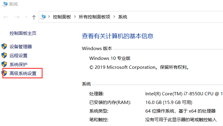 此电脑 > 右键 属性 > 高级系统设置